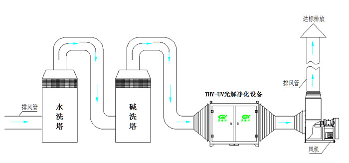 化工廢氣處理考慮運營成本及安全性,本方案工藝路線擬定采用“通風系統(風機、收集罩、管道)+預處理系統(水噴淋塔+堿洗塔)+核心凈化系統(UV光解凈化設備)”來進行化工廢氣處理。工藝設備圖如下: